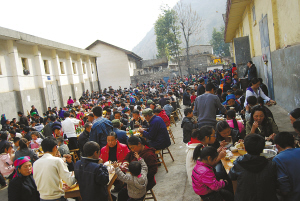 每年秋收后到翌年播種前,是四川涼山金陽縣人結婚的黃金季節(jié)。無論是在縣城還是農村,不管是吃“九斗碗”,還是吃“坨坨肉”,大家都喜歡擺壩壩宴。在金陽縣城,常??梢钥吹竭@樣一幅景象:數(shù)百人聚在一處,圍坐于一張張方桌旁,伸箸暢食,舉杯暢飲。一盆盆肉端上桌子,主人不停地招呼客人趁熱吃?! ?/p>