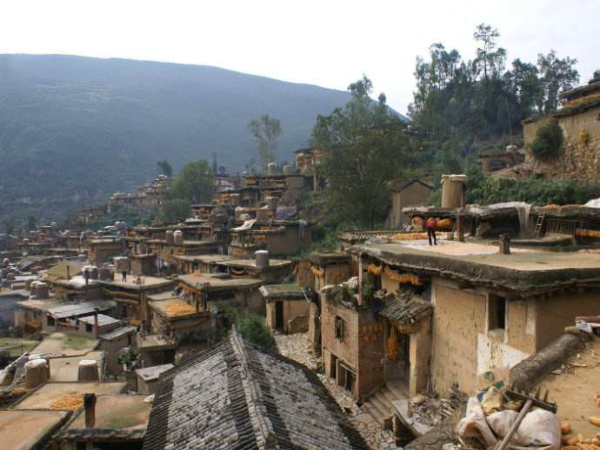 彝族是農(nóng)牧兼營的民族,村寨的分布與坐落有其獨特的傳承。彝族的村寨多坐落在海拔2000~3000米的山區(qū)、半山區(qū),相沿聚族而居。為適應(yīng)西南地區(qū)亞熱帶氣候和山地特點,彝民們便就地取材,以一種最容易、最節(jié)省錢財人力的建房方式,創(chuàng)造出中國建筑的獨特樣式——土掌房。土掌房多建于山地斜坡上,以石為墻基,用土坯砌墻或用土筑墻,墻上架梁,梁上鋪木板、木條或竹子,上面再鋪一層土,經(jīng)灑水抿捶,形成平臺房頂,不漏雨水。有的大梁架在木柱上,擔(dān)上墊木,鋪茅草或稻草,草上覆蓋稀泥,再放細(xì)土捶實而成。