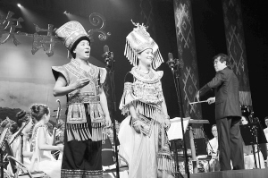 廣西戲劇院成立一年來,承擔(dān)起壯劇、桂劇、彩調(diào)劇3個(gè)國(guó)家級(jí)非物質(zhì)文化遺產(chǎn)劇目和京劇國(guó)粹藝術(shù)的傳承、保護(hù)、發(fā)展重任,不斷推出具有“美麗廣西、壯鄉(xiāng)風(fēng)格、時(shí)代特征、和諧兼容”的舞臺(tái)藝術(shù)精品,此次推出的《壯族詩情》便是其中之一?!秹炎逶娗椤饭卜帧暗毓摹薄ⅰ疤旄琛?、“水秀”、“山雄”4個(gè)章節(jié),以150多名演職員的演出陣容,通過合唱、獨(dú)唱以及民族器樂演奏的形式,如詩如畫地描述了廣西壯族的風(fēng)土人情,突出了“美麗廣西”時(shí)代主旋律。圖為《壯族詩情》演出現(xiàn)場(chǎng)。