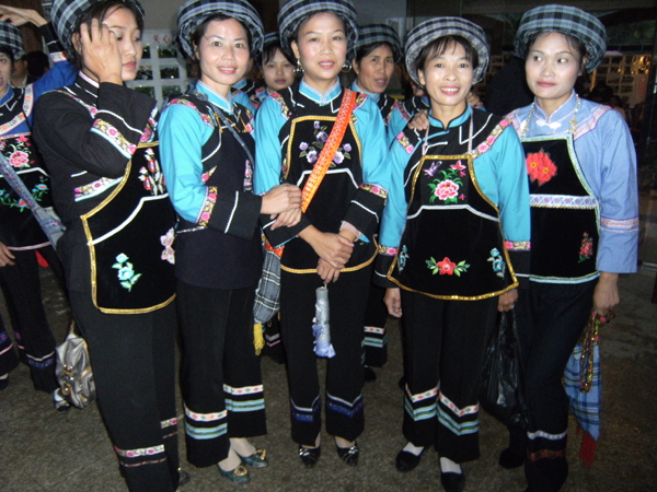 西南地區(qū)的服飾分布地區(qū)包括貴州省黔南布依族苗族自治州羅甸,黔西南州望謨、冊(cè)亨、貞豐、安龍、興義、興仁、安順市的鎮(zhèn)寧、關(guān)嶺、紫云三縣的南部以及云南省羅平等縣(市),基本上都屬于布依語(yǔ)第一土語(yǔ)區(qū)。這個(gè)地區(qū)婦女普遍穿大襟衣、長(zhǎng)褲腳。衣服的盤(pán)肩、袖口、襟沿鑲有蘭干。褲腳為大褶邊,或藍(lán)色褲腳鑲一截青布和蘭干。衣服的長(zhǎng)短和褲腳的大小,各地區(qū)都不相同。冊(cè)亨一帶衣服較短,褲腳短小,包花格長(zhǎng)帕,胸頸掛彩珠項(xiàng)圈,手套玉石或骨制手鐲;望謨一帶青年婦女把花格帕折疊后纏戴;貞豐一帶的衣服較長(zhǎng),褲腳不折邊,青年和老年婦女基本相同,但青年婦女包的花帕形狀如牛角(人稱“牛角帕”);靠近北部地區(qū),衣褲都較長(zhǎng),而且不鑲蘭干,衣褲和帕子多為青色;安龍、興義一帶則多包白帕,衣褲亦不鑲蘭干;西南一帶地區(qū)衣褲已漸不鑲蘭干,但還穿自織的土布衣服,頭上還包花格帕,一些地區(qū)與漢族婦女裝束完全一樣了。