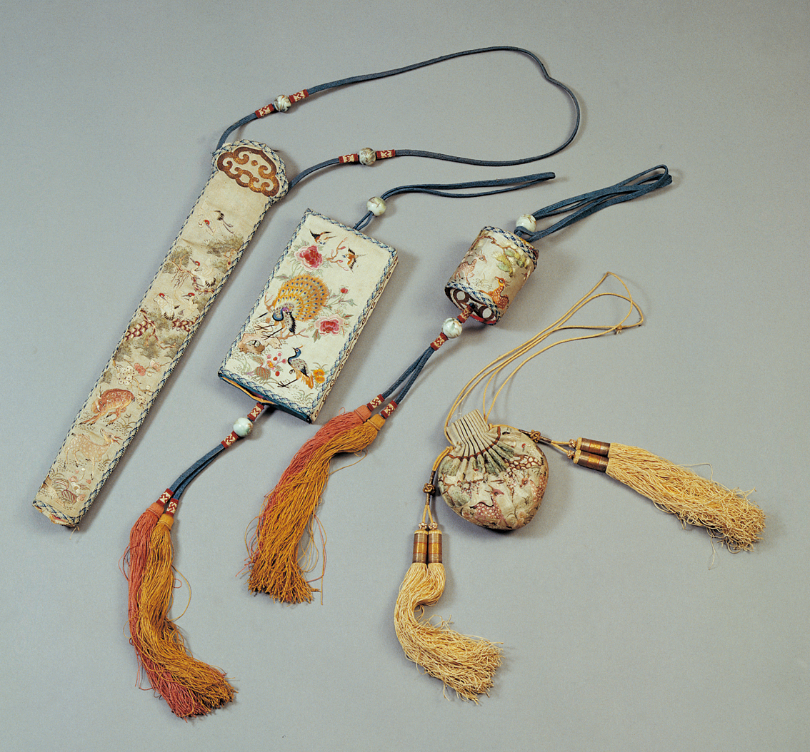 滿(mǎn)族服飾色彩多以淡雅的白色、藍(lán)紫色為主,紅、粉、淡黃、黑等色也是其服飾的常用色。白色在滿(mǎn)族服飾中是一個(gè)重要的顏色,因?yàn)椋瑵M(mǎn)族傳統(tǒng)上有尚白習(xí)俗,以白色為潔、為貴,白色象征著吉祥如意,所以,在滿(mǎn)族服飾中常在紅色、藍(lán)色等其他顏色的旗袍上鑲白色的花邊。滿(mǎn)族男女都喜愛(ài)在腰間或衣服的大襟上掛佩飾。男子有火鐮、耳勺、牙簽、眼鏡盒、扇帶。滿(mǎn)族女子喜歡盤(pán)頭翅,梳兩把頭或旗髻,戴耳環(huán)、手鐲、戒指、頭簪、大絨花和鬢花等各種裝飾品。擅長(zhǎng)刺繡,她們?cè)谝陆?、鞋面、香囊、荷包、枕頭等物品上刺繡花卉、芳草、鶴鹿、龍鳳等吉祥圖案(圖為滿(mǎn)族清代繡花湖色緞佩飾,中央民族大學(xué)民族博物館館藏)。