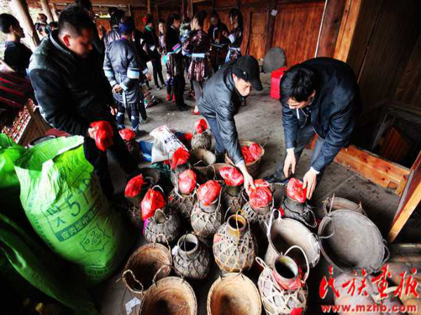 這次結(jié)婚的共有15對新人(多時有二三十對),均來自本寨的青年男女。婚禮從大年二十六開始,共進(jìn)行三天,在三天的婚禮中新郎新娘家均有婚宴,尤以第一天中午的規(guī)模最大也最為隆重。