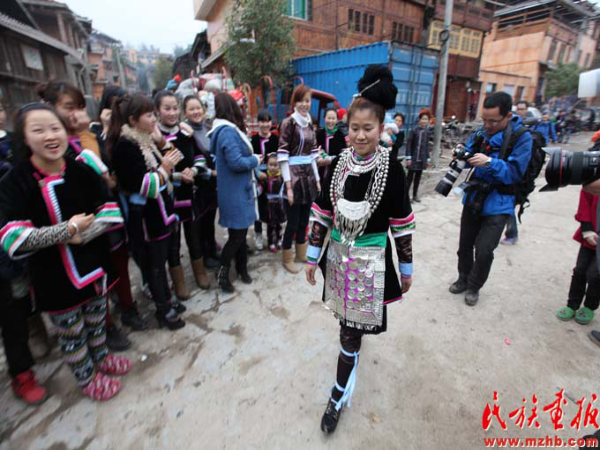 新娘走秀和鬼師做法是婚禮儀式的一項主要內(nèi)容。新娘走秀在第一天上午九時舉行,這是新娘唯一向眾人展示自己的機會也是婚禮中最為隆重的儀式,這時街心廣場及道路兩側(cè)擠滿了看熱鬧的群眾。之前新娘們都要精心打扮一番,穿上嶄新漂亮的傳統(tǒng)衣裙,戴上各種銀飾,然后在親人的目送下離開家門。新娘走秀與漢族結(jié)婚的迎親有很大不同,沒有新郎伴娘的陪伴,更沒有車水馬龍的迎親隊伍,只是一人獨身前行。鬼師做法在新娘登場后進(jìn)行,我們只是見到了鬼師做法后留下的一些物品。