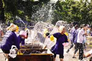 “扁水”是當(dāng)?shù)胤窖裕瑸閼蛩?、潑水之意?!氨馑笨駳g節(jié)源于侗族“為也”習(xí)俗,為做客之意,指村寨之間村民們的互相訪問(wèn),是當(dāng)?shù)匾?guī)模最大的社交和娛樂(lè)活動(dòng)。“為也”時(shí),當(dāng)?shù)囟弊迦罕姂蛩娝駳g,久而久之就形成了“扁水”狂歡節(jié)。