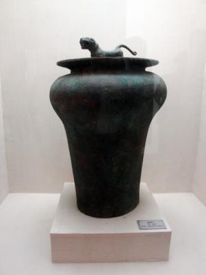 為巴文化最具代表性的青銅樂器,高68cm,上徑36cm,底徑28cm,重30公斤。1989年夏,萬州甘寧鄉(xiāng)發(fā)大水,錞于從紅旗水庫泄洪道巨石縫中被發(fā)現(xiàn),由萬州博物館收藏。2005年6月,調(diào)集到重慶中國三峽博物館。這件錞于屬戰(zhàn)國晚期的巴人作品,其通體完整,音質(zhì)優(yōu)良,造型厚重,形體特大,有“錞于王”之譽(yù)。其上部的鈕作虎形,栩栩如生,不怒而威,虎腿以漩紋勾畫出神物特征,是巴人虎崇拜的又一重要例證?;⑩o的周圍,分布著五組“圖語”:椎髻人面、羽人擊鼓與獨(dú)木舟、魚與勾連云紋、手心紋、神鳥與四蒂紋。這些圖語對研究巴文化是極為重要的資料,其中羽人擊鼓與獨(dú)木舟已經(jīng)被選取為重慶中國三峽博物館外墻浮雕的中心圖案(戰(zhàn)國青銅虎鈕錞于圖片由老鐵提供)。