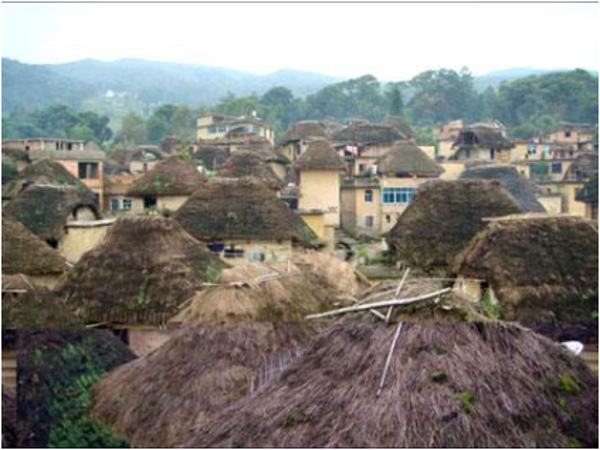 哈尼族一個(gè)核心的家庭的一幢完整的磨菇房,包括正房、左右?guī)俊⑼ピ汉蛧鷫Φ葦?shù)個(gè)建筑單元,家中配有腳碓、石磨、水缸、織機(jī)、藍(lán)靛染缸、犁、耙、刀、斧、鋤、籮和火塘等生產(chǎn)生活設(shè)施,滿(mǎn)足作為社會(huì)生產(chǎn)和生活單位的家庭的諸多需求。若干家庭的磨菇房逐次排列,就逐漸變成了一個(gè)哈尼族山寨的磨菇房群落。
