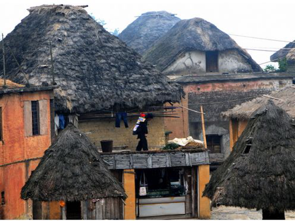 蘑菇房由土基墻、竹木架和茅草頂組成,屋頂為四個(gè)斜坡面。房子一般分三層:底層關(guān)牛馬堆放農(nóng)具等;中層用木板鋪設(shè),隔成左、中、右三間,中間設(shè)有一個(gè)常年煙火不斷的方形火塘;頂層則用泥土覆蓋,既能防火,又可堆放物品。蘑菇房造型美觀,別具一格。冬暖夏涼。
