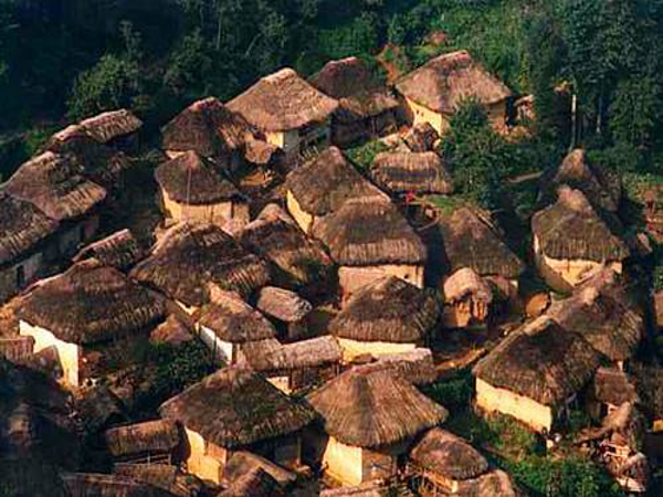 蘑菇房由土基墻、竹木架和茅草頂組成,屋頂為四個斜坡面。房子一般分三層:底層關牛馬堆放農(nóng)具等;中層用木板鋪設,隔成左、中、右三間,中間設有一個常年煙火不斷的方形火塘;頂層則用泥土覆蓋,既能防火,又可堆放物品。蘑菇房造型美觀,別具一格。冬暖夏涼。