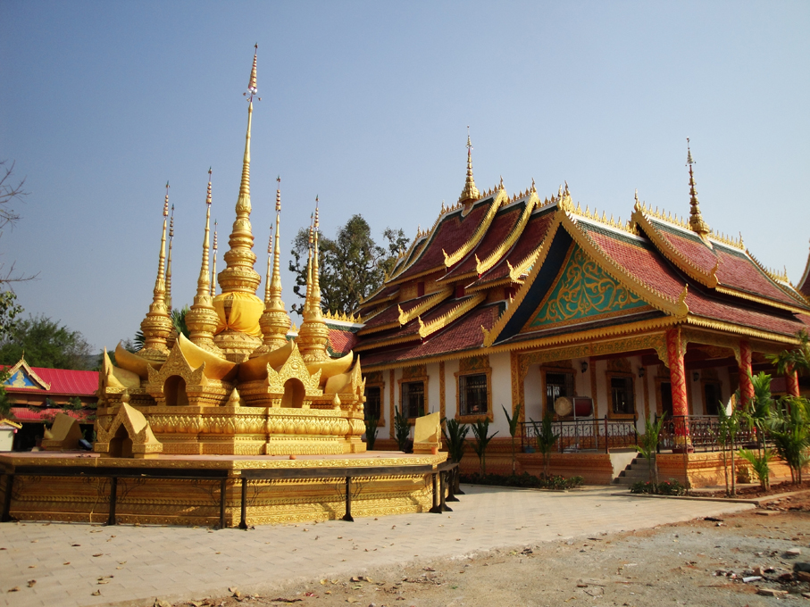 佛寺建筑是信仰小乘佛教的傣族地區(qū)建筑的一大特色,以落地重檐多坡面平瓦建筑為主。由大殿、僧舍和鼓房組成,中心佛寺外加一座戒堂、一座藏經(jīng)樓、一座佛塔。主殿外觀一般是單檐或重檐歇山式屋頂,或懸山式頂、多角或亞字形重檐歇山式頂。坡面進(jìn)行一至二次跌落后有兩層或上中下三層的單面坡或三面坡、五面坡,坡面的多少和佛寺的級(jí)別有關(guān)。屋面按縱向分為兩段式或三段式或五段式,以中間最高,使龐大威嚴(yán)的屋面呈現(xiàn)出優(yōu)美起伏的曲線。