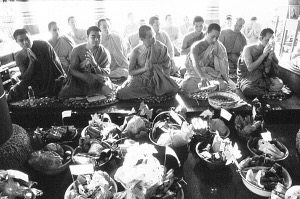 早晨8點(diǎn)多鐘,隨著緬寺大佛爺都比罕念誦起那古老的滴水詞經(jīng),賧奉儀式開始了。我隨玉波一家坐在從家里帶來的涼席上。緬寺里已擺放不下人們送來賧奉的物品,只好放在緬寺的周圍。人們用一根白線拴系著物品連著緬寺,以示并沒有遠(yuǎn)離緬寺和佛祖。