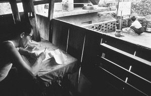清晨,像毛毛細(xì)雨般的濃霧籠罩著整個(gè)傣寨,樹葉上的積霧如雨點(diǎn)“滴噠、滴噠”掉落在地上。隨著晨雞清脆的拍翅報(bào)曉聲,幢幢竹樓相繼亮起了燈。今天人們都要早起,要往緬寺里送賧奉的物品。玉波賧奉的物品太多,除了她的“薩拉帥”,還有她全家每人五份的賧奉物品。她的爺爺、奶奶、爸爸、媽媽加上我,搬送了兩趟才把物品送完。最后,在院子的門口上方留下一份,叫賧“帕巴結(jié)”,意思是留給死在外面不能進(jìn)緬寺的野鬼。