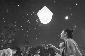 4月13日是傣歷新年的除夕夜,人們?cè)跒憸娼叿棚w孔明燈,寄托心愿。