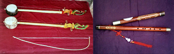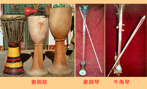 傣劇是在傣族民間歌曲和歌舞音樂的基礎(chǔ)上發(fā)展起來的,并借鑒了漢族戲曲藝術(shù)的表現(xiàn)手段,流傳于德宏、保山、臨滄等傣族聚居區(qū)。傣劇包括多種男女唱腔,男腔多用羽調(diào)式,女腔多用徵調(diào)式。20世紀50年代以來,傣劇吸收了多種傣族民歌和舞曲,豐富了唱腔,增強了音樂的表現(xiàn)力。傣劇唱腔基本是上下句組成的樂段及其變化反復。由于唱詞字數(shù)可多可少,因此唱腔樂句長短不一。過去,傣劇只用小堂鼓、鑼、镲等伴奏,后逐步采用了多種民族樂器及西洋管弦樂器,組成新型的傣劇樂隊。傣族的民族樂器屬于吹奏樂器的有篳、葫蘆簫(如圖)、豎笛、木葉等;彈撥樂器有玎琴、口弦等;弓弦樂器有西玎(玎琴)、牛角玎(牛角琴)等;打擊樂器有象腳鼓、光隆、光邊、光邦、鑼、镲等。象腳鼓、鑼、镲的合奏是傣族器樂合奏的主要形式。