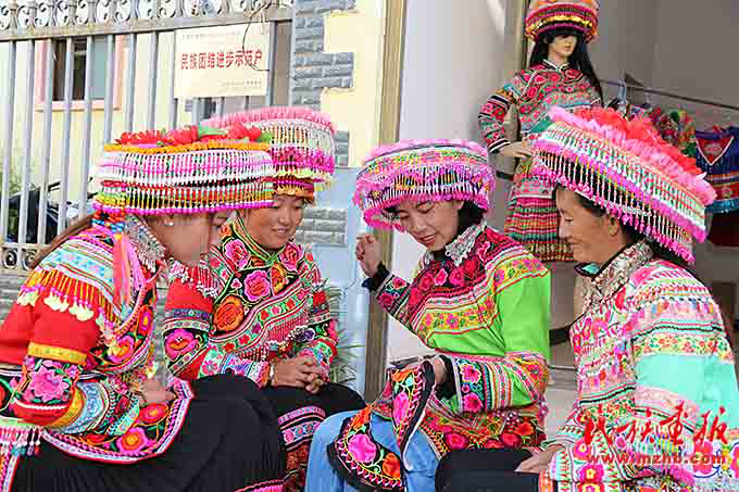 搬遷到傈園新村后,安學芬(左二)和妹妹安學珍在政府的扶持下辦起了刺繡手工坊,為了提高繡品質(zhì)量,他們經(jīng)常與同村婦女進行刺繡手藝交流