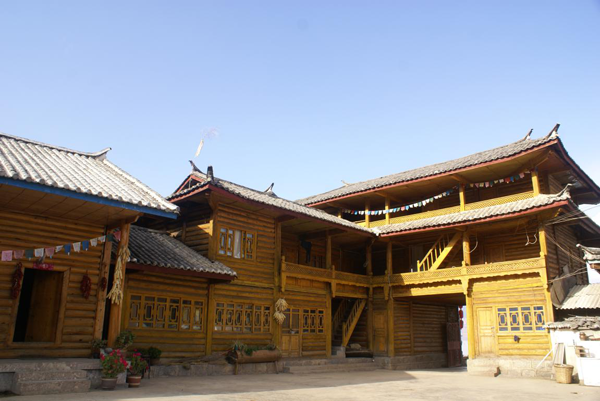 納西族的民居在民國時期普遍呈“用圓木縱橫相架,層面高至七、八尺,即加椽行,覆之以板,石壓其上”的“木楞房”形制。通常的情況是,在木楞房的正房(祖房)納西族稱為“吉美”(意為母房)中,有一個納西語稱為“格古魯”的高出地面的灶臺,有家神供其上。中間為火塘,安置大型鑄鐵制三腳架于其上,用以燒水、做飯和取暖。會客、聚餐和老人就寢都會在中間的灶臺上。這種普遍的房屋式樣以及室內(nèi)設置在廣大山區(qū)和香格里拉三壩、寧蒗永寧目前還普遍流行,當然現(xiàn)在的房子已經(jīng)比以前高大寬敞了許多。