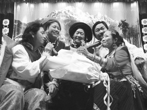 2008年,阿玻赴美國(guó)參加聯(lián)合國(guó)之春藝術(shù)節(jié)的演出。在匹茲堡,有一位70多歲的老太太觀看了阿玻參加的3場(chǎng)演出。她對(duì)阿玻說(shuō):“雖然我沒(méi)有去過(guò)你的家鄉(xiāng),也聽(tīng)不懂你唱的歌詞,但是透過(guò)你的歌聲我能想象到,你的家鄉(xiāng)一定有雪山、草地、牛羊,有溫暖的陽(yáng)光,那一定是個(gè)美麗的地方?!卑⒉5男脑谀且豢填潉?dòng)了。他說(shuō):“在美國(guó),我用納西語(yǔ)演唱了《夢(mèng)中的香格里拉》。雖然語(yǔ)言不通,但是人們還這么懂我的歌,讓我很感動(dòng)?!?/p>