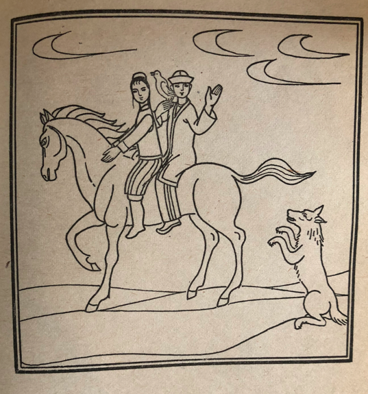 汗想坐得靠近那個美女一點(diǎn)兒,可是,他剛往前一湊,美女一下子變成了狼,上去把汗抓了個頭破血流,然后很快地跑掉了。狼又從后面趕上了少年和那位姑娘。少年又對狼說:“我也不想跟這匹馬分開了,能不能想個辦法呢?”狼說:“可以?!痹诨氐降谝粋€汗的附近時,狼又搖身一變,變成了一匹駿馬。少年?duì)恐E馬送到汗那里。汗回謝以后,就給了他那只金絲鳥。少年帶著金絲鳥和姑娘一起騎上馬又走了。