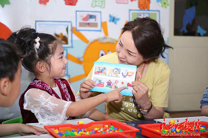 有一年春季,古麗孜娜提剛從外地學習回來,就接手了一個新班。這個班的幼兒大多來自農(nóng)村,在常規(guī)習慣、自理能力、適應(yīng)性、語言發(fā)展等方面都較弱。每次上幼兒園都又哭又鬧。古麗孜娜提還未成家,她把孩子們當成自己的孩子,耐心地安撫每一個孩子,走進他們的心靈。
