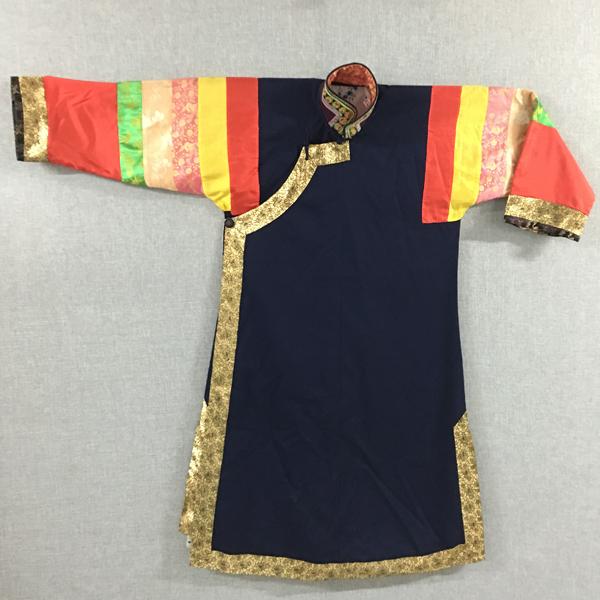 民族文化宮博物館收藏的這件立領(lǐng)右衽大襟五色袖“彩虹衣”,是土族女子盛裝時(shí)的一種服飾,征集于青海省互助土族自治縣。年代為20世紀(jì)30年代。“彩虹衣”長(zhǎng)117厘米,胸圍120厘米,袖長(zhǎng)59厘米,棉質(zhì)。整件女服右衽大襟,藍(lán)棉布襯里,左右側(cè)開(kāi)衩,黑色“拉花”立領(lǐng),領(lǐng)上以土族傳統(tǒng)刺繡工藝—盤(pán)繡刺繡紅綠相間圓形圖案和辮形線條,綴三枚金色圓銅扣。衣袖為紅、黃、綠、白、粉五色彩布、彩緞拼接的“彩虹袖”,其中紅色為主色,占整個(gè)衣袖約一半面積,其余四色布?jí)K相鄰,均勻分布于衣袖上方,布?jí)K上刺繡有金色梅、蘭、竹、菊?qǐng)D案。衣袖袖口鑲寬約3厘米黑色絲絨底刺繡花邊,花邊里外均繡有花草紋樣,做工精致?;ㄟ吷辖訉捈s10厘米金色牡丹紋花邊,與襟邊、下擺、衩口等處所貼金色牡丹紋花邊相互呼應(yīng),極富設(shè)計(jì)感。