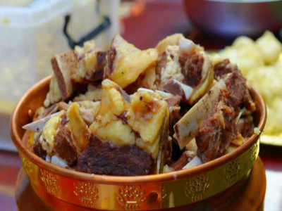 土族的飲食習(xí)慣,由其生產(chǎn)特點決定。元代以前,土族及其先民主要從事畜牧業(yè),飲食結(jié)構(gòu)單一,以牛羊肉、奶制品為主,還食用青稞炒面等。明代以后,農(nóng)業(yè)逐漸取代畜牧業(yè)成為主要經(jīng)濟(jì)產(chǎn)業(yè),飲食結(jié)構(gòu)也逐漸轉(zhuǎn)變?yōu)榧Z食、薯類為主,但在風(fēng)俗習(xí)慣上仍然保留著牧業(yè)時代的痕跡。如在招待賓客時桌上供“西買日”(酥油花飾的彩繪炒面盒)和“適迭瑪?shù)崭瘛保ㄈ齻€鍋饃供品);在一盤不加任何作料的整塊熟肉上插一把五寸刀敬給貴賓;在酒壺上系一撮白羊毛等等。土族人認(rèn)為這是對貴賓最隆重的招待。