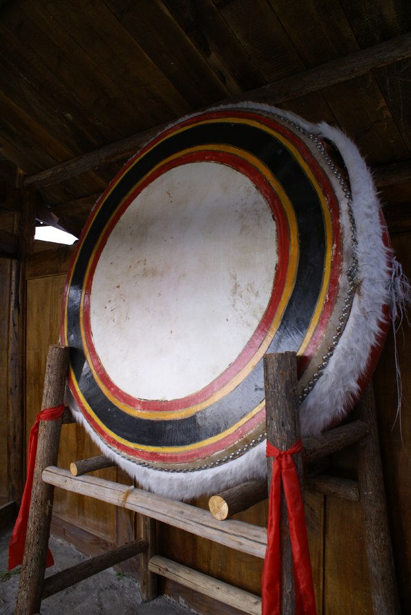 羌族羊皮鼓是打擊樂(lè)器,又名“羌鈴鼓”,羌語(yǔ)稱(chēng)“切歐?!薄扒袩釀e日木”。有兩種形狀,一種是圓形鼓面的鈴鼓,直徑大約30—40厘米。鼓邊寬約15厘米,鼓柄置于正中,抓柄的長(zhǎng)度與鼓面的直徑相同,左手從背面握柄。另一種是扇子形狀的鈴鼓,鼓框和鼓柄為鐵制,抓柄端有一裝飾環(huán)圈,圈內(nèi)串以數(shù)個(gè)銅錢(qián)。兩種形制鼓面均蒙羊皮,各鼓音高低不一,鼓錘為竹制,敲擊的一端略微呈弓形。羊皮鼓的打法和鼓點(diǎn)的節(jié)奏變化豐富。目前,搜集到的有硬三鞭、軟三鞭、野雞撲、偷點(diǎn)子、牛擦癢等十多種。這些鼓點(diǎn)穿插在每個(gè)唱段與舞蹈銜接變化中,使表演者在統(tǒng)一的步伐、統(tǒng)一的動(dòng)作中,調(diào)節(jié)了節(jié)奏氣氛。由于表演具有即興式特點(diǎn),表演者的技術(shù)嫻熟程度和思想情緒變化將直接影響技巧的發(fā)揮。羊皮鼓突出鼓的表演,氣氛熱烈歡快,動(dòng)作粗獷質(zhì)樸,如“禳星辰”動(dòng)作,就是在鼓點(diǎn)、唱腔、動(dòng)作的有機(jī)結(jié)合中,表現(xiàn)出凜冽的氣勢(shì)。羊皮鼓在表演中,不僅給舞蹈提供了節(jié)奏,豐富了氣氛,而且鼓點(diǎn)的擊打更形成和衍化出許多獨(dú)特的舞蹈語(yǔ)匯。