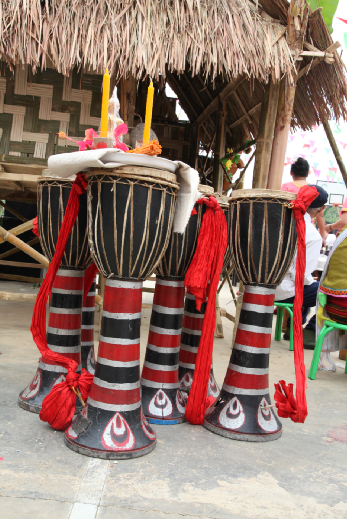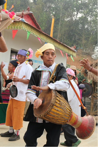 打歌:保山地區(qū)施甸縣布朗人(濮滿)在祭龍活動(dòng)或結(jié)婚佳期都要舉行“打歌”?!按蚋琛币彩沁叧柽吿璧囊馑??!按蚋琛敝跋纫x出一個(gè)能歌善舞、嫻于交際的“打歌頭”,由他主持歌舞晚會(huì)。屆時(shí)庭院中安置幾張方桌,桌上陳設(shè)豬頭、松子、葵瓜子、酒等類東西?!按蚋桀^”將豬頭抬起,邊唱邊繞桌三轉(zhuǎn),然后把豬頭放在桌上,燃香三柱插于豬鼻內(nèi),眾男女即在樂(lè)器聲中翩翩起舞,邊唱邊跳“大翻身”“小翻身”等舞蹈。伴泰樂(lè)器有蘆笙、小三弦、竹笛等。眾人在“打歌頭”的帶領(lǐng)下直跳到東方發(fā)白,興盡方散。
