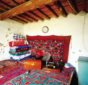 新疆維吾爾自治區(qū)木壘縣大南溝烏孜別克民族鄉(xiāng)鄉(xiāng)政府為烏孜別克牧民集中興建了定居房。新村街道整齊,土墻圍成的院落獨門獨院。院落很大,前院種菜栽樹,有水井,房后是牛欄羊圈。有的還單建了廂房作廚房。這里的住房都是長方形土坯平頂房,玻璃窗,墻壁很厚,冬暖夏涼。屋內(nèi)橫梁和走廊的木柱、木梁上有的是工筆重彩的花紋圖案,有的用雕花石膏鑲嵌或磚、木雕刻后鑲嵌,做工精細。墻壁上有整齊排列的拱形壁龕,里面擺著日用品和工藝品,四周也鑲嵌著花紋圖案。居民們住板炕,在屋里地上挖一小坑,坑內(nèi)放置火爐,鐵皮煙囪通向室外,坑上橫搭木板成板炕,板炕上鋪花氈坐毯??繅σ贿厰[著疊得整齊的被褥,繡花枕頭對稱地立在被褥上。墻上掛著壁毯,整個室內(nèi)既有局部美,又有整體美,賞心悅目。