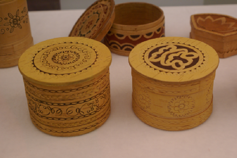 鄂溫克族的雕刻包括骨刻、木刻與樺樹皮刻。骨刻的工具是鐵制刻刀。骨刻制品一般有筷子、衣扣、板指、使用馴鹿時(shí)所用鞍子的配件、縫衣物時(shí)為拉緊線而用的拉線棒等,不同的用具上刻有不同的花紋。木刻的工具也是鐵制刻刀。木刻一般多用于神像、刀柄、煙鍋和白樺木制的馴鹿鞍具、背夾上。一般的花紋有“奧豪爾”,這種花紋有勾有彎,仿松樹形狀,有馴鹿不會(huì)跑掉的意思。背夾上的花紋則是犭罕 、馴鹿、松鼠、天鵝等。樺樹皮雕的工具用犭罕骨制成的刀,分二、三、四齒幾種。雕刻時(shí),先用小刀或錐子把圖案輕輕畫在樺樹皮上,再用犭罕骨刻刀耐心地刻出花紋圖案。圖案一般有云卷紋、菱形紋、水波紋、花鳥等。用顏料涂上藍(lán)、紅色,使圖案呈現(xiàn)出色彩對(duì)比和立體感。鄂溫克族樺樹皮制品有盆、碗、盒、桶、箱等多種多樣,其制品本身就是非常古樸風(fēng)雅的藝術(shù)品,再雕刻上各種花紋圖案,倍添精致、美觀。