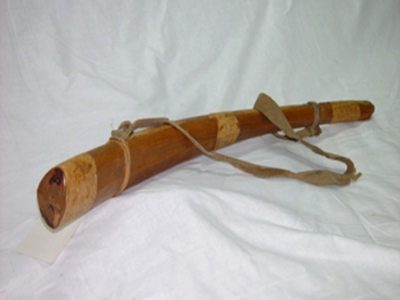 民族文化宮館藏鹿哨為紅松木質(zhì)地,牛角形,長71厘米,中間鏤空,以細(xì)鱗魚皮熬膠粘合,頭部細(xì),尾部粗并呈喇叭狀;在頭、尾、中間箍3道箍,在接近頭尾的兩端纏細(xì)皮繩為環(huán),環(huán)上系寬皮帶,便于出獵時(shí)背挎于肩或平時(shí)置放時(shí)懸掛。