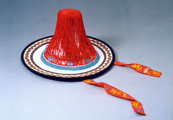 帽子是姑娘和已婚婦女的區(qū)別標(biāo)志。姑娘不戴帽子,前額戴“沙日達(dá)什戈”。這是一條寬約三寸長約一尺,下邊緣用紅色或白色珊瑚小珠穿縫許多珠穗的紅色布帶。已婚婦女身穿高領(lǐng)偏襟長袍,一般由綢、緞、布、褐、皮料縫制。衣領(lǐng)高齊耳根,袍子一般以綠、藍(lán)色為主,但也有深紅、紫紅等顏色。袍子下擺兩邊開衩,衣袖口至肘部用各色織錦緞、彩綢、彩緞花邊一圈圈縫綴裝飾。腰系腰帶(裕固族也叫“胡兒”,即系腰),主要是桃紅色或綠色,長袍上面罩一件高領(lǐng)偏襟坎肩,但也有無領(lǐng)偏襟坎肩。
