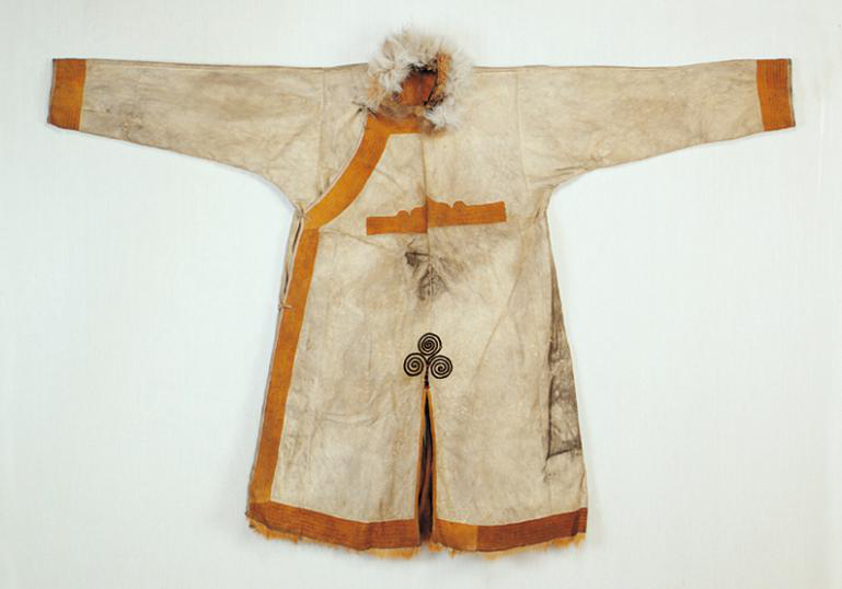 縫制衣服的針最初都是骨和木制的,將狍子的小腿骨加工成細(xì)骨簽,再在石頭上磨成骨針。據(jù)說(shuō)用落葉松的心木做成的針比骨針還硬。縫制厚皮衣物時(shí),比如上鞋底,骨針和木針都扎不動(dòng),他們又用狍角制成角錐。頂針也是用獸骨制作的,鄂倫春族婦女縫制衣服時(shí)不像漢族那樣將頂針戴在中指上,拉線的時(shí)候針尖朝外。她們是將頂針戴在食指上,拉線的時(shí)候讓針尖朝自己,為的是避免扎到別人。獸皮服裝必須要用獸筋線縫紉。把涼干了的狍、鹿和犴筋,用木錘砸成綿軟的纖維,在搓成細(xì)細(xì)的線就可以使用了。用獸筋線縫紉的皮衣褲,即使剮壞了、磨爛了,卻始終不存在開(kāi)線的問(wèn)題(上圖為鄂倫春傳統(tǒng)服裝——狍皮袍,劉軍供圖)。
