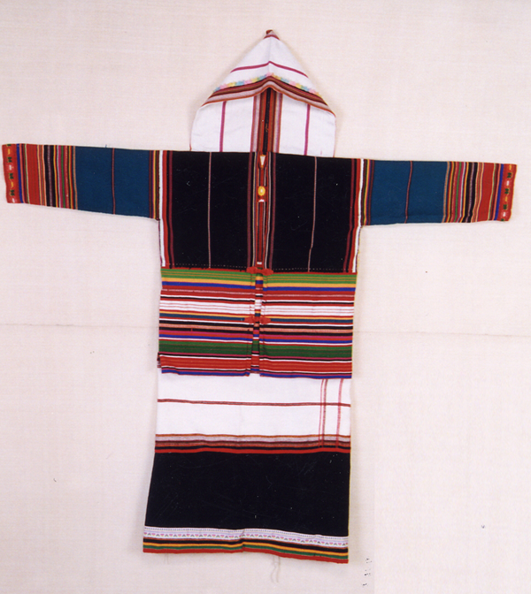 基諾族婦女上衣為無領(lǐng)對開,上半部多采用黑布或白布,下半部及衣袖用紅、藍(lán)、黃、白等7色布配制或刺繡而成,用紅色鑲邊,上衣背部縫一塊約3寸見方的白布,上面繡有圓形太陽花式圖案(基諾族稱月亮花);內(nèi)衣為上部呈方形下呈菱形的兜肚式緊身衣,上部方形為鮮艷的條飾花紋,下部菱形繡著各式圖案。下身多著紅色鑲邊的黑色合縫短裙,并用一尺左右的黑布纏綁小腿。發(fā)型為椎髻,婚前髻在腦后右方,婚后髻在前額正中。頭戴披風(fēng)式尖帽,這種尖帽用長約60公分、寬23公分的豎線花紋土布對折,縫住其一邊而成,戴時(shí)又在帽沿上折起一指許的一道邊。