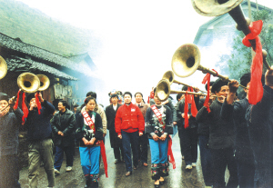 苗族姑娘們,穿鑲花邊衣褲,圍繡花抹裙,扎花絲頭巾,配銀飾花帶,可真叫艷麗。我們這些遠(yuǎn)道而來(lái)的游客受到熱烈的迎接,姑娘們用古樸的攔門(mén)對(duì)歌為我們洗塵。攔門(mén)地點(diǎn)是在村頭的小橋邊,姑娘們拉著一排民族織錦帶,滿面春風(fēng)地等待客人,兩邊苗鼓、獅子、嗩吶、甲馬長(zhǎng)號(hào)夾道歡迎。儀式按苗族風(fēng)俗,由苗族姑娘們先唱熱情的迎客苗歌,再請(qǐng)客人唱歌作客,對(duì)歌三次方過(guò)攔門(mén)第一關(guān)。緊接著她們又捧出大碗苞谷酒向客人們一一敬酒。熱情好客的姑娘們一定要待客人喝了香醇的美酒后,才示攔門(mén)結(jié)束。然后,又一路鞭炮,一路號(hào)角吹吹打打,把我們請(qǐng)進(jìn)苗寨。
