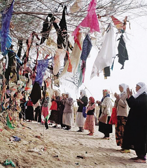 在新疆,尤其是在維吾爾族聚居的南疆,普遍存在類似內(nèi)地廟會式的麻扎朝拜活動。朝拜者面向麻扎傾訴心中的哀怨痛苦,以各種方式表達(dá)自己的祈求:有向麻扎求消災(zāi)避禍的,有求富貴發(fā)財?shù)模€有求夫妻和睦的,求理想伴侶的,求生兒育女的,求老有所養(yǎng)的,求天降甘霖的……