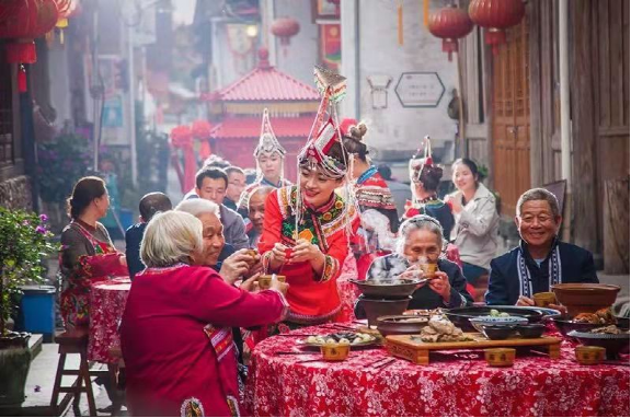 2.畬族婚嫁:婚禮的特色較多。迎親隊(duì)伍到村時(shí),嫁方村上女性拿杉木枝欄路,表示晚上要對(duì)歌;到中堂時(shí),嫁方請(qǐng)四位男子與迎親隊(duì)伍中四人相對(duì)作揖,此儀式叫“拾田螺”,表示歡迎;中餐由嫁方請(qǐng)迎親隊(duì)伍,媒人就坐中堂席首位,叫“落腳酒”;晚餐由娶方請(qǐng)嫁方親戚朋友,舅公就坐首席,叫請(qǐng)“大酒”;午后,赤郎舉行“借鍋”儀式,赤郎端點(diǎn)紅燭放有一刀肉和兩塊豆腐的米篩向灶神作揖后,用謎語(yǔ)念借所有的炊具,姑嫂們把能藏的炊具都藏起來(lái),念不到就不拿出來(lái),要全部重借,“借鍋”意為娶方借嫁方炊具宴請(qǐng)客人。借好之后,赤郎要?dú)⑷⒎郊姨魜?lái)的一只公雞用以嫁方“請(qǐng)祖公”,殺雞時(shí),規(guī)定血不許滴到地上,滴一滴地上罰一碗酒;宴席中途嫁方女歌手會(huì)起歌頭找赤郎對(duì)歌。畬族婚禮的又一個(gè)特點(diǎn)是,新娘夜行嫁,卯時(shí)進(jìn)夫家門(mén)。行嫁時(shí)有牛在前頭踏路,意為新娘一切都要新的,牛踏過(guò)的路為新路。以往嫁妝有鋤頭、斗笠、棕衣、線簍、火籠等,體現(xiàn)了畬族婦女熱愛(ài)勞動(dòng)。