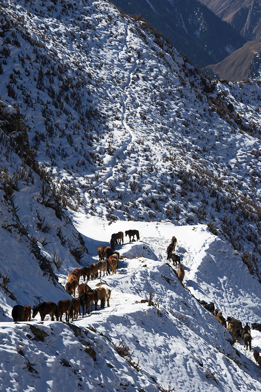 喬隆格爾冬牧場(chǎng)與山外的氣候差異大,暖陽(yáng)如春。另一個(gè)突出特點(diǎn)是草好,草密的地方?jīng)]膝,縱橫倒伏一片,比南方秋田摞在一起的蒲草都密實(shí)??諝馇邃?,腐草味兒、上一年遺留的畜糞味兒和著遠(yuǎn)處高大冰崖透散過(guò)來(lái)的寒氣撲面而來(lái),最突出的還有野生動(dòng)物的腥氣,牧羊犬夜夜不停地叫聲在告訴你它們往復(fù)經(jīng)過(guò)的頻率。山上能看到大角的北山羊,野鵪鶉被驚到嘩啦啦地飛起一片。若是誰(shuí)家的羊死了扔在野外,幾天都能看到禿鷲在天空盤(pán)旋。最不可思議的是雪豹,光顧一次造成的損失遠(yuǎn)比一群狼大。