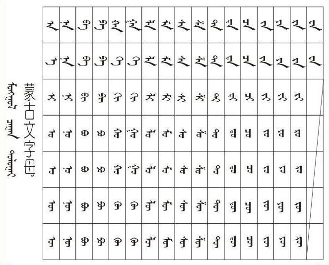 回鶻式蒙古文字是一種拼音文字。字母分元音和輔音兩大類,雖然至今人們尚未在文獻記載中發(fā)現(xiàn)其字母表,但據(jù)后人對這種文字材料進行分析,歸納出有19個字母。其中,5個表示元音,14個表示輔音。書寫時元音字母和輔音字母筆畫連在一起,形成一個整體蒙古字。每個字母視其出現(xiàn)在詞里的位置不同,寫法略有變化,分詞首、詞中、詞末3種變體。阿拼寫時一般以詞為單位,上下連書。字序從上到下,行序從左到右。因其是以回鶻文為基礎創(chuàng)建的,因此稱其為回鶻式蒙古文。