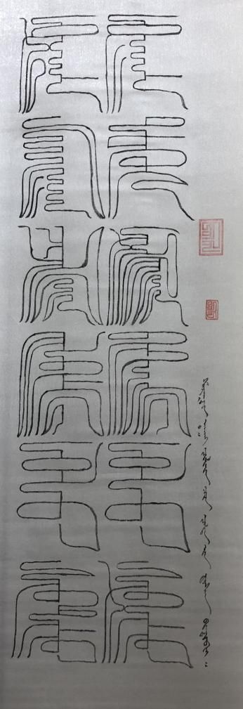 蘇永布文字。1686年由喀爾喀高僧,一世咱那巴咱爾創(chuàng)制。這種文字源自梵文蘭札體字母,主要用于宗教和裝飾目的。由于字體繁難,并未在民間流行。