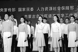 9月14日,來自中國傳媒大學(xué)、內(nèi)蒙古大學(xué)的學(xué)生代表和鄂爾多斯市群眾代表在全國推普周開幕式上朗誦《讀中國》。新華社記者 朱文哲攝