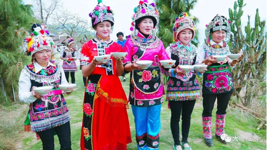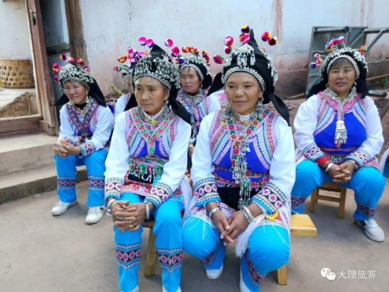 男子頭頂氈帽(又稱氈窩),穿大襟衣、大襠褲,赤足或穿草鞋,披羊皮,外出背皮袋(現(xiàn)已基本消失)。女子裹高包頭、額上飾銀桂花,衣為布襟,外套坎肩,腰系大圍腰,大圍腰左右下三邊繡五色花,為動植物圖案,足穿繡花鳳頭鞋,用本地產(chǎn)綠布條制褲子,不鎖腳邊,腰間背圓形白氈裹背,所穿服飾顏色鮮艷、質(zhì)地厚重,盡顯遠古南詔皇室服飾遺風。