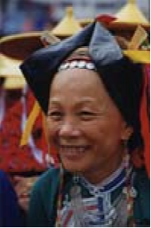 惠東老年婦女一般在腦后梳一發(fā)髻,近似長方形,然后套上發(fā)網(wǎng),壓平,左右各插一個別子,上方和中部各插一支梅花,再圍上一條黑巾,用飾有珠花的別針別上。