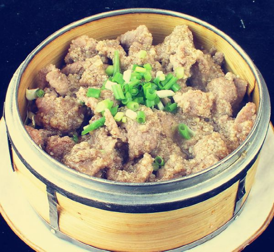 粉蒸肉以肉為主料,采用米粉和其他調(diào)味料制作而成。粉蒸肉糯而清香,酥而爽口,有牛肉、排骨、豬舌、牛肚、肥腸、羊肉等不同選擇,味道也根據(jù)個(gè)人喜好在辣椒碟中添加醋、糖、麻油等調(diào)味料,粉蒸肉味道鮮美、口感松軟、回味無(wú)窮。