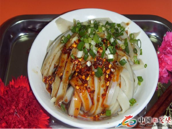 貴州甕安的豌豆涼粉獨具特色,歷史悠久,據(jù)說它的產(chǎn)生也有200年歷史。豌豆涼粉制作特別,工序多、時間長,技術(shù)十分精巧。它的原料是豌豆,吃豌豆涼粉之所以考究就在于它不用醬油,也不直接放食鹽調(diào)味,而是用特別的加了鹽的風(fēng)豆豉醬。食用時,可用刀切成條、塊、片、絲狀盛在碗里,配以蔥花、姜米、蒜水、紅油辣椒和風(fēng)鼓醬涼拌即可。