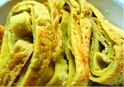 由于綠豆鍋巴的制作和原料有所不同,它的味道也不同。綠豆鍋巴粉在鍋內(nèi)烙成,呈四周薄中間稍厚,入鍋后,爐堂的松針毛毛噴噴火一燒,頓時鍋內(nèi)的鍋巴粉呈現(xiàn)出無數(shù)小氣泡,制成后切成條狀,切口有無數(shù)的小孔,像海綿狀,食用時,入鹽、進(jìn)味、可口,硬香中顯現(xiàn)脆嫩,鹽香中蘊含微甘。