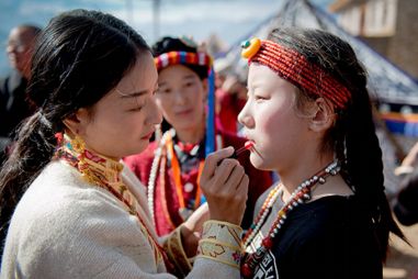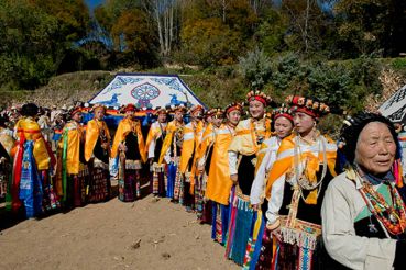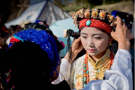 盤好發(fā)髻,佩戴好頭飾,在肩、背系好五彩哈達(dá)后,由本村具有威望的女性長(zhǎng)者引領(lǐng)來(lái)到儀式現(xiàn)場(chǎng)。法號(hào)聲中,煨桑的青煙裊裊升起,威嚴(yán)的活佛主持誦經(jīng)祈福儀式。隨后,德高望重的長(zhǎng)者為參加儀式的女子送祝福茶,長(zhǎng)輩為姑娘們獻(xiàn)哈達(dá)。一系列儀式結(jié)束后,無(wú)論男女老少,都來(lái)到場(chǎng)地中央,踏歌起舞,跳起吉祥的鍋莊。