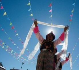 藏族自古崇尚白色,認(rèn)為白色是純潔、吉祥、誠(chéng)摯、善良、正義和繁榮的象征。藏族崇尚白色由來(lái)已久,先民們把羊毛掛在門楣和各種器皿上;山口、要道的嘛呢石堆上放白色石頭;插箭祭“拉則”(山神的居所)時(shí),在箭桿上系白色羊毛等等,無(wú)處不見(jiàn)白色崇拜的印記,藏族居住的青藏高原人們習(xí)慣稱做雪域,作為最常見(jiàn)的景物伴隨著民族漫長(zhǎng)的歷史,白色更自然地進(jìn)入藏民族的審美觀念中,滲入藏民族的靈魂深處。