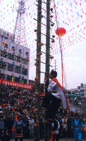 節(jié)日里,婦女們穿著鑲花邊的黑色上衣和點綴著各種銀飾物的花裙,佩戴耳環(huán)、項鏈等首飾,風(fēng)采奪人。男人穿著麻布短衣褲,腰系紅黃長帶,小腿系吊簡,腰佩長刀,肩挎箭包,英姿勃勃。節(jié)目的廣場上,堅趄兩根二十米高的樹干,四周用藤蔓拉緊固定,樹桿上插有三十六把明晃晃的長刀,作為向上攀登的橫檔,刀刃向上,寒光逼人,謂之“刀竿午間。鞭炮齊鳴,鑼鼓震天”。身穿大紅抱、頭纏紅布包頭、赤腳的五名“玩火者”,齊涌至竿下,圍繞刀竿唱歌跳舞,將斟滿的白酒一飲而盡,縱身飛上刀竿。雙手緊提刀面,運足氣的腳掌斜置在鋒利的刀刃上,勇敢、靈巧地向上攀登。全場鴉雀無聲,大家屏住呼吸仰面觀看,對他們的氣功絕技贊嘆不已。噼噼啪啪的鞭炮聲來自竿頂優(yōu)勝者,響徹云霄。全場歡呼跳躍,爭相向爬桿者敬獻(xiàn)美酒。對歌、跳舞、蕩秋千活動為節(jié)日增添了濃郁的氣氛。丟煙包(煙盒)活動別具一格,青年男女各站一方,互擲煙包,姑娘將小伙的煙包收藏起來,說明姑娘接受了小伙子的愛慕。