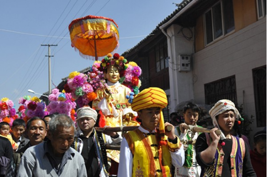 農歷二月初六,迎太子入城。這一天在佛教徒的帶領下,人們焚香沐浴,衣冠整齊,虔誠地將“太子”(用布扎油漆制成的太子行像)請到行宮或本主廟里。這一年的新郎為太子抬轎,希望能得到太子的保佑而使新婚的妻子孕生男兒。