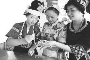 貴州凱里下司古鎮(zhèn)的苗族姑娘在捏月亮粑。 吳吉斌攝