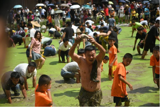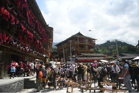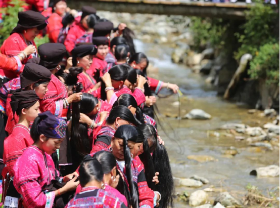 曬衣節(jié)當天還進行了嗩吶鑼鼓迎賓、瑤嫂長發(fā)梳妝展示、“抬金狗”送祝福、紅瑤服飾加工展示、紅瑤集體婚禮等活動,豐富多彩的民俗文化、濃郁的民族風情,讓各地游客流連忘返。